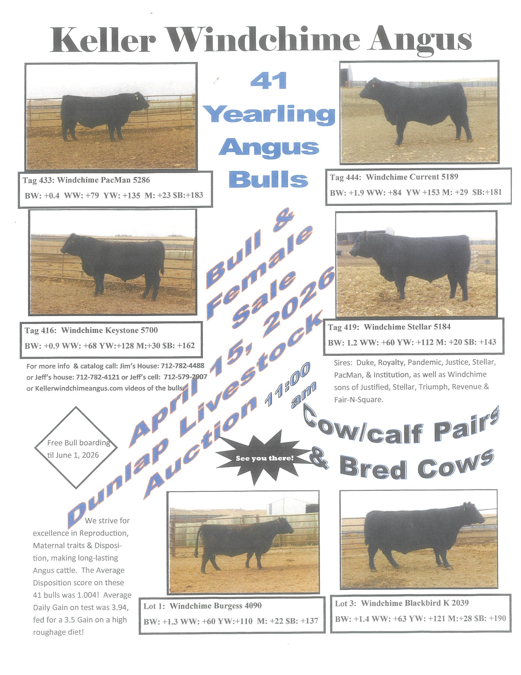 This year Keller Windchime will be bringing you 41 yearling Angus Bulls. With additional cow/calf pairs and bred cows.
