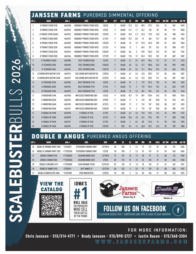 Janssen's will offer 24 Sim Bulls & Double B will offer 7 Ang Bulls. For years the Janssen Family has been offering outstanding bulls to the public. We have sold thousands of Feeders, Fed Cattle, & Breeding Stock with these powerful genetics. Don't miss these great bulls!